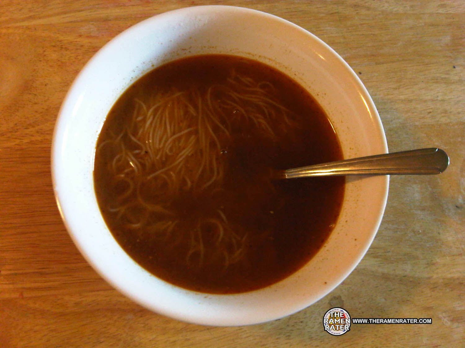Click image to enlarge. First off, the color is deep deep crimson. It’s rather striking actually, but that’s as far as positive strikes go from me. Noodles were slimy. Broth was greasy, tasted weird, had weird bits of seasoning that weren’t enjoyable at all, greasy, unenjoyable. Yeah – I’m not finishing the bowl – I’m giving it 0.0 out of 5.0 stars. Even with three packets, neat packaging and all, it’s absolutely nasty.