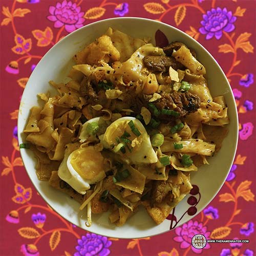 Finished (click to enlarge). Added soft egg, Salad Cosmo mung bean sprouts, sauteed beef, spring onion, and tofu puff. The broad noodle was excellent – went for the full 6 minutes and it worked well. Flavor was that of oily Sichuan pepper and black vinegar – grating on the soul, however fleshing out the fascination bone. 3.5 out of 5.0 stars. EAN bar code 6926410330763.